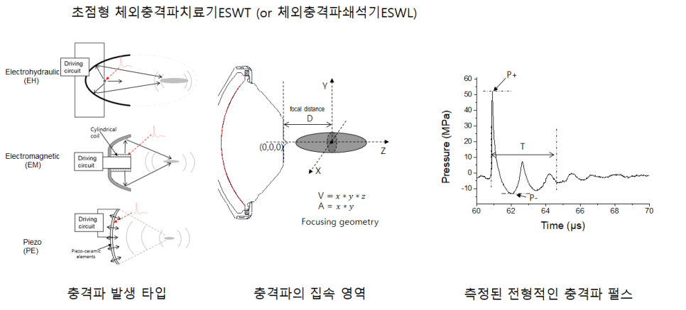 체외충격파석술 (extracorporeal shock wave lithotripsy, ESWL)은 체외에서 발생된 충격파를 체내의 결석에 집속 조사하여 결석을 분쇄하고 치료 효과를 얻는 비침습적인 치료술로, 1980년대 중반, 임상에 도입된 이후 대부분의 결석 치료는 ESWL 비수술적인 방식으로 전환되었다. ESWL는 1990년대 초반 낮은 음향 출력을 가지는 충격파를 통증을 유발하는 연조직 병변에 조사하여 치료 효과를 얻는 ESWT (extracorporeal shock wave therapy)로 진화했다. 석회화된 건염에 충격파를 조사하면 통증이 감소하는 치료 효과를 얻을 수 있게 되어, 그동안 보존적인 치료가 어려웠던 근골격계 난치성 통증 치료에 활용되기 시작했다. 현재 ESWT는 건염, 족저근막염, 근손상, 창상, 불유합 치료 등 다양한 적응증에 사용되고 있으며, 최근에는 심혈관계 관련 질환 (예, 심장병 및 발기 부전)까지 활용 범위를 확대하고 있다.