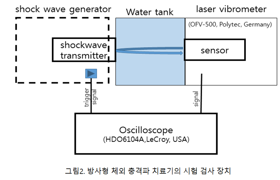 ○ 방법: 레이저 바이브로미터(OFV-5000,Polytec, Germany)의 레이저 빔을 를 검사 측정하고자 하는 방사형 충격파 치료기의 shock wave transmitter의 표면 중앙을 향하도록 정렬한다. 충격파 발생 장치의 최소, 중간, 최대 출력값 설정에서의 shock wave transmitter의 진동을 레이저 바이브로미터를 이용하여 감지하고 오실로스코프(HDO6104A, LeCroy, USA)를 이용하여 기록한다.